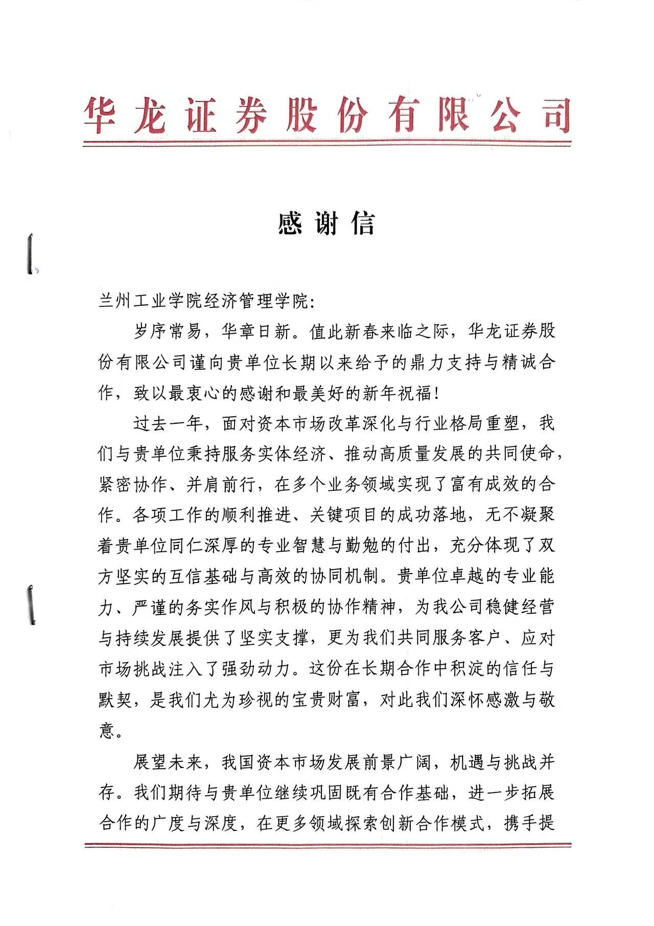 华龙证券致信感谢兰州工业学院经管学院:校企合作结硕果 携手共赢谱新篇