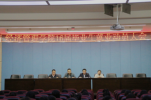 2015年9月21日晚,经济管理学院在八楼会议中心召开2016届毕业生就业动员大会。党总支书记王春升、副院长牛永红、毕业班辅导员以及2016届全体毕业生参加了大会。